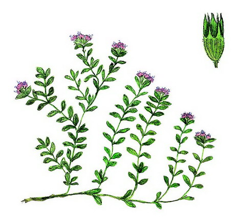 Низкорослый полукустарничек. Побеги приподымающиеся, до 10–20 см высотой. Листья от узколанцетных до яйцевидных, короткочерешковые, эллиптические или яйцевидные, 8–18 мм длиной, 5–10 мм шириной. Максимальная ширина листа находится в середине или ниже середины пластинки. Прицветные листья сходны со стеблевыми. Цветоносные стебли опушены по 4 ребрам. Грани острые, из них 2 более узкие. Соцветие головчатое, к концу цветения вытянутое. Чашечки колокольчатые, 3,5–4 мм длиной, пурпуровые, реснички на зубцах нижней губы немногочисленные (до 12 пар). Цветки мелкие, розовато-сиреневые [2, 3].