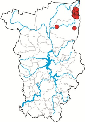 В большинстве местообитаний численность низкая (1–25 особей). Более крупные локальные популяции отмечены в трех пунктах (истоки р. Сибиревской Мартайки, хребет Чувальский камень и камень Ветлан) [8, 9]. На хребте Чувальский камень и на Ветлане отмечены значительные колебания численности по годам. По сравнению с 2010 г. численность многорядника копьевидного в 2016 г. снизилась в 2,3 раза на Чувале и в 2,5 раза на Ветлане. Наиболее вероятной причиной стала гибель растений в аномально сухой и жаркий сезон 2010 г., а также физическое истребление части растений по пути следования туристов к скалам.
