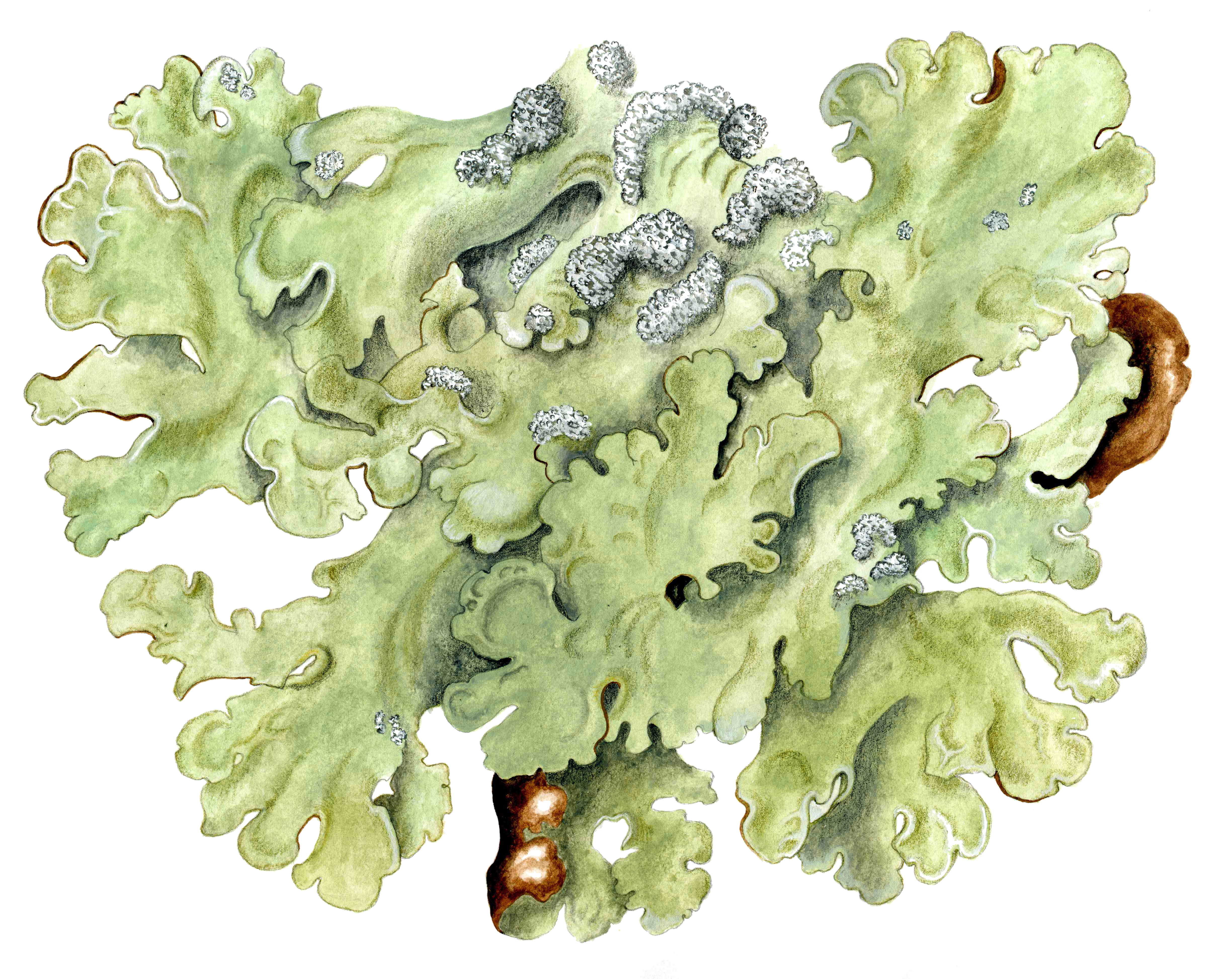 Слоевище неправильно розетковидное, до 20 см в диаметре, в центре плотно прикрепляется к субстрату ризинами, по периферии лопасти слегка приподнимаются. Верхняя поверхность желтовато-зеленоватая, до серовато-зеленоватой, обычно морщинистая, реже гладкая. Нижняя сторона матовая, черная или темно-коричневая, по краям более светлая. Сорали поверхностные, сливающиеся или раздельные, одноцветные со слоевищем [2].