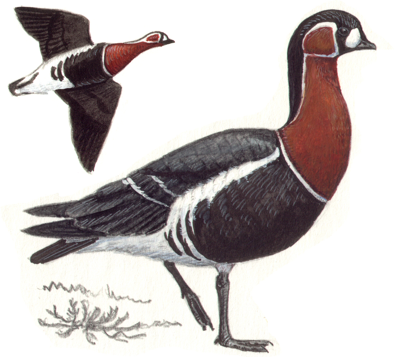 Исключительно яркий гусь: безошибочно узнаваем по оригинальной окраске из сочетаний черного, белого и каштаново-красного. Бросается в глаза очень маленький клюв. Длина птицы около 60 см, размах крыльев 120–130 см [6].