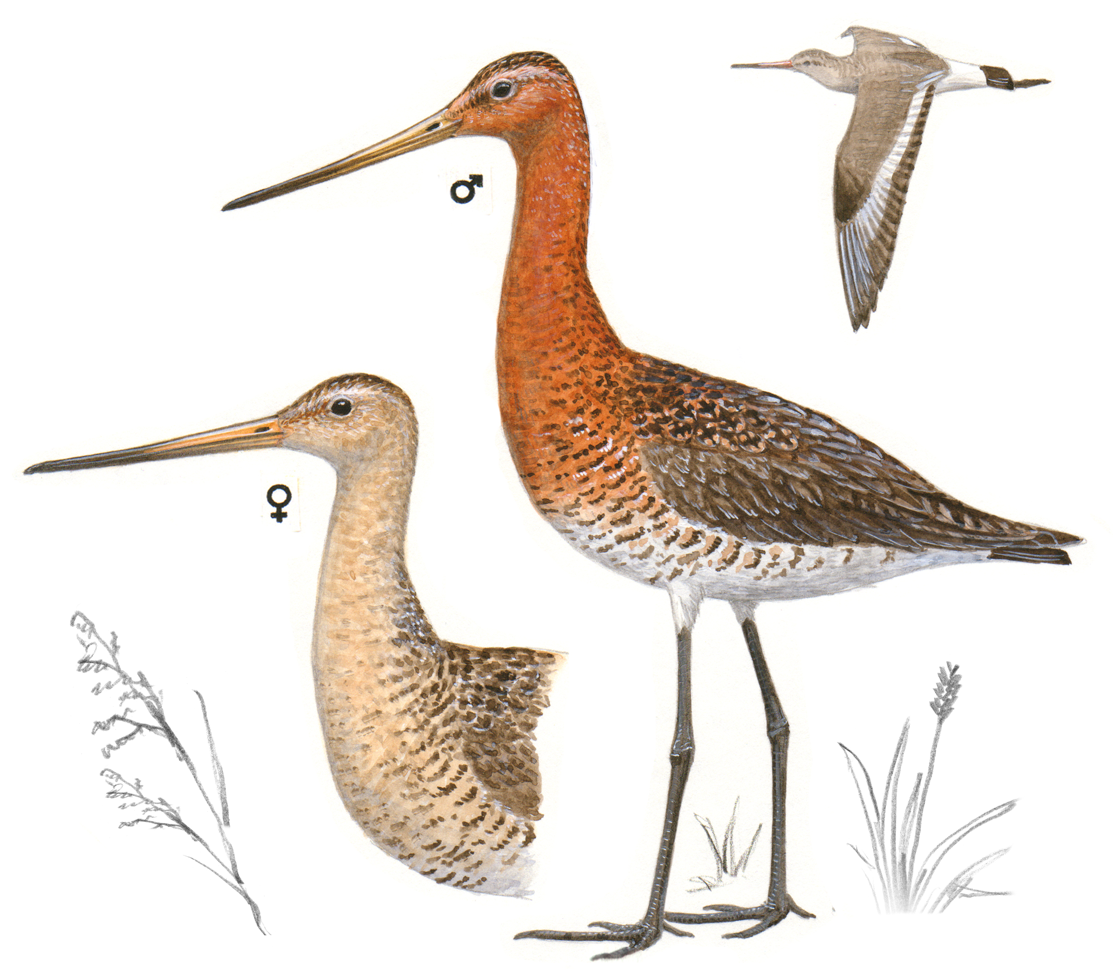 Крупный, величиной с голубя, кулик с длинными ногами и длинным клювом. Окраска головы, шеи и верха груди самца в брачном наряде ярко-рыжая, низ груди в виде сочетания рыжих, белых и темно-бурых пестрин, брюхо белое с немногими темными пестринами. Длина 36–44 см, размах крыльев 62–70 см. Самец токует, летая неправильными кругами на высоте 10–50 м и размеренно повторяя звучное «вуЭтю-вуЭтю-вуЭтю...» или же более быстрое «теввеЕ-теввеЕ-теввеЕ...» и прочие похожие звуки в различных модификациях. Может токовать и стоя на земле [4].