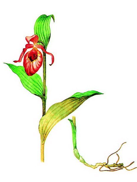 Маленькое многолетнее травянистое растение с прямостоячим стеблем 8–15 см высотой, с одним прикорневым листом и одиночным крупным цветком. Лист черешковый, с яйцевидной пластинкой 3–4 см длиной, сверху темно-зеленой, снизу более бледной, обычно с розово-фиолетовым оттенком, с волнистым краем. Листочки околоцветника темно-розовые, лучевидно расходящиеся, 12–15 мм длиной. Губа 15–20 мм длиной, в форме туфельки, желтоватая, с красновато-бурыми полосками и пятнами.