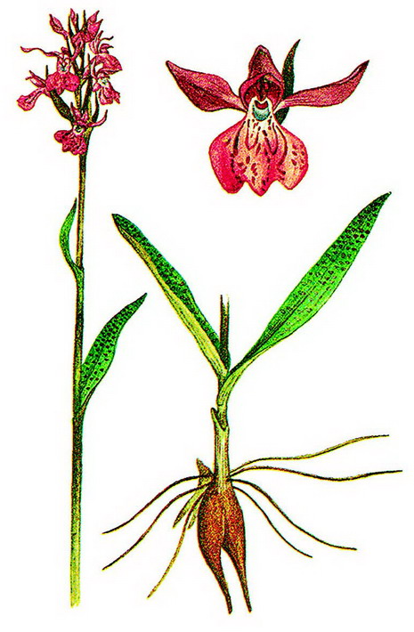 Корнеклубневой травянистый многолетник с пальчато-лопастным сжатым корневым клубнем; концы лопастей клубня корневидно утончены. Стебель тонкий, 10–25 см высотой. Листья линейные, вдоль сложенные, с выступающим килем, дуговидно изогнутые, вполне развитых листьев 2–4; нижние листья с наибольшей шириной около середины или выше ее. Цветки собраны в густую кисть, розово-пурпурные. Прицветники ланцетные, почти равны по длине цветкам. Губа округло-яйцевидная, коротко трехлопастная; средняя лопасть треугольная, длиннее боковых или равна им; боковые лопасти полукругло-ромбические. Шпорец прямой [2].