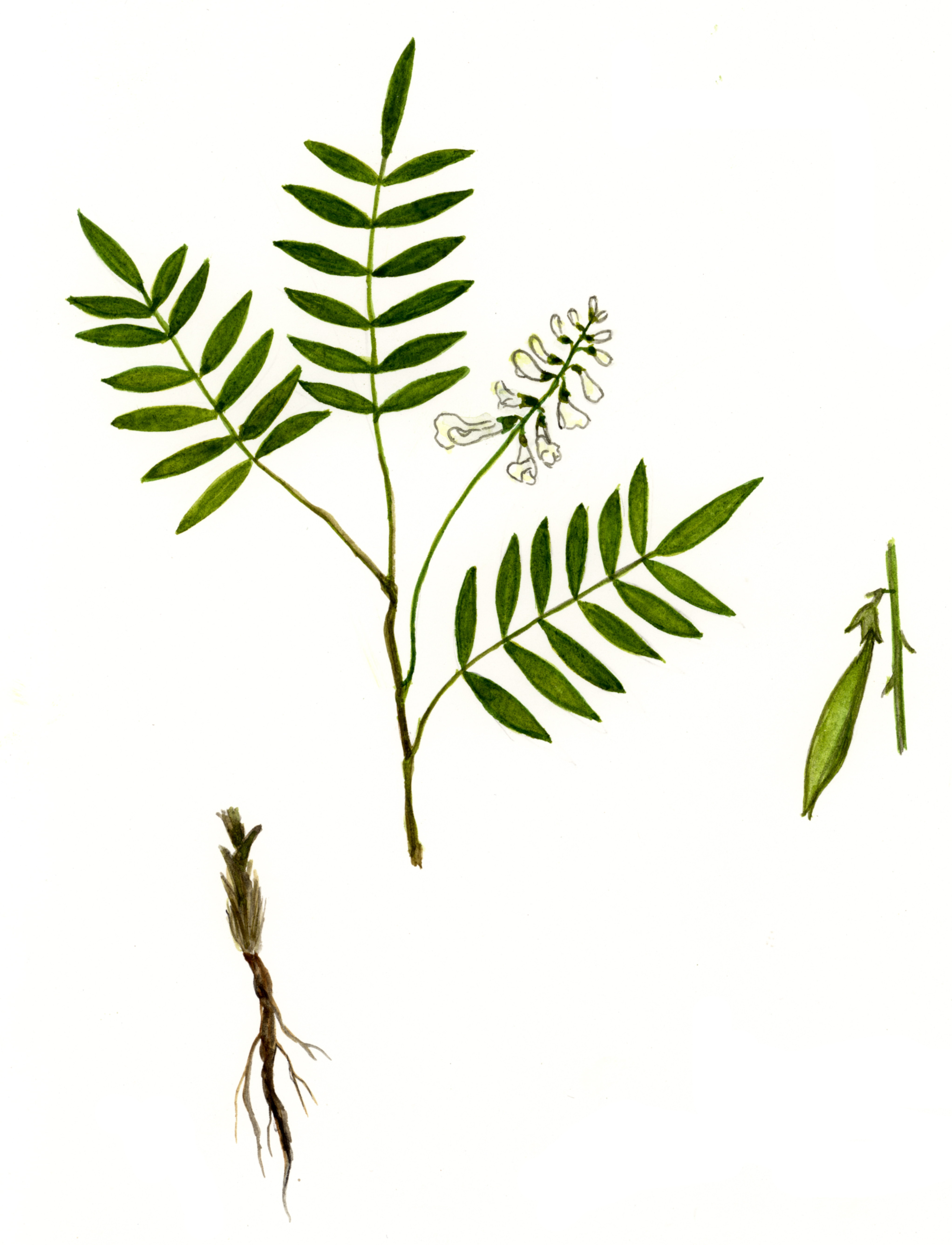 Многолетнее голое или слегка прижато-волосистое травянистое растение с приподнимающимися или распростертыми стеблями, достигающими в длину 40–100 см. Листья 10–20 см длиной с 5–7 парами яйцевидных, тупых на верхушке листочков 1,8–4 см длиной, сверху голых, снизу рассеянно прижато и коротковолосистых. Цветки в яйцевидных кистях на длинных цветоносах. Прицветники шиловидно-ланцетные, 1,5–3 мм длиной, короче трубки чашечки. Чашечка ширококолокольчатая, 5–6 мм длиной, с шиловидными неравными зубцами. Венчик зеленовато-желтый. Флаг 11–15 мм длиной, с округлой пластинкой и небольшой выемкой наверху. Крылья 10–13 мм длиной, с округлой на верхушке пластинкой. Лодочка 9–11 мм длиной. Бобы вверх направленные 3–4 см длиной и около 4 мм шириной, слегка серповидно изогнутые, голые или с редкими мелкими белыми волосками [2].